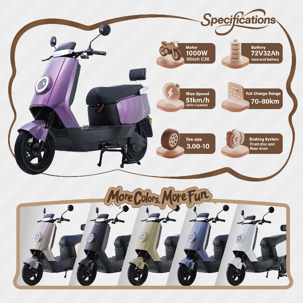 | Max. speed | 51km/h(3 speeds) | Full charge range | 70-80km |